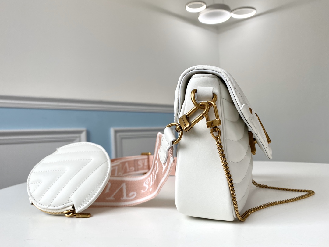 This chic shoulder bag is crafted of quilted calfskin leather in white. The shoulder bag features a gold chain strap, an adjustable shoulder strap, and edgy hardware with an aged gold metal finish. The top flap opens to a white microfiber interior with a patch pocket. Enjoy this bag for day or evening use with the luxury and style of Louis Vuitton!