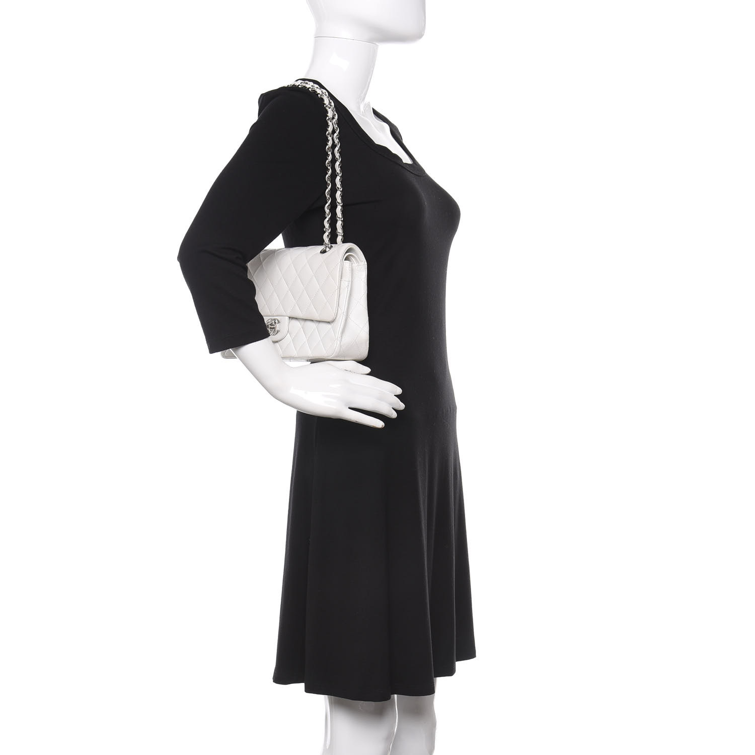 This stunning shoulder bag is crafted of diamond quilted luxurious caviar leather in white. The bag features a silver chain-link leather-threaded shoulder strap, a rear patch pocket, and a facing Chanel CC turn lock. This opens to reveal an inner flap and a matte white leather interior with patch pockets.
