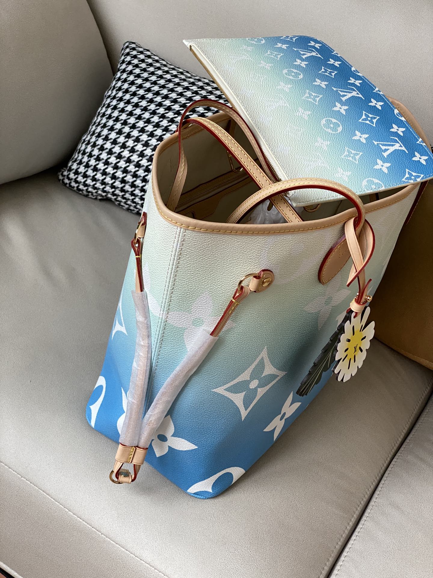 This stylish tote is crafted of classic Louis Vuitton monogram coated canvas in an ombre blue to beige contrast. The bag features vachetta cowhide leather shoulder straps, trim and side cinch cords, with polished brass hardware. The wide top is open to a striped light beige fabric interior with a zipper pocket.
